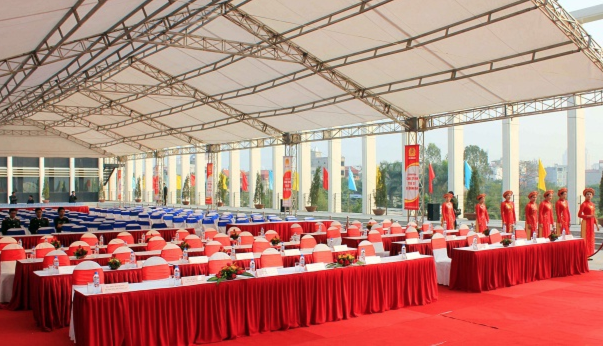 Nhà bạt được thi công và dàn dựng theo yêu cầu kích thước của quý khách hàng. kinh nghiệm và phúc vụ nhiều năm trong nghề lĩnh vực sự kiện.